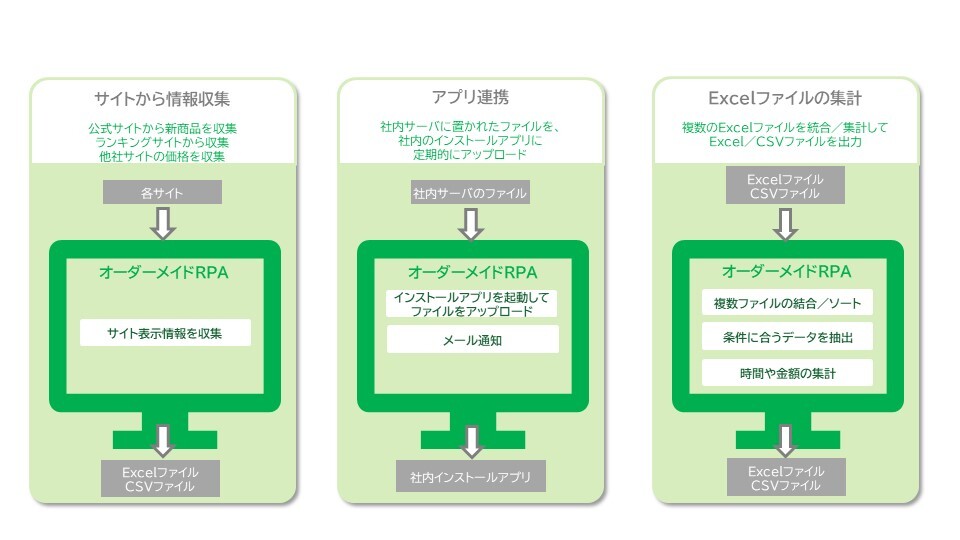 RPAはデータ収集や加工を得意としています。 例:Web上の商品情報、為替相場や株の価格