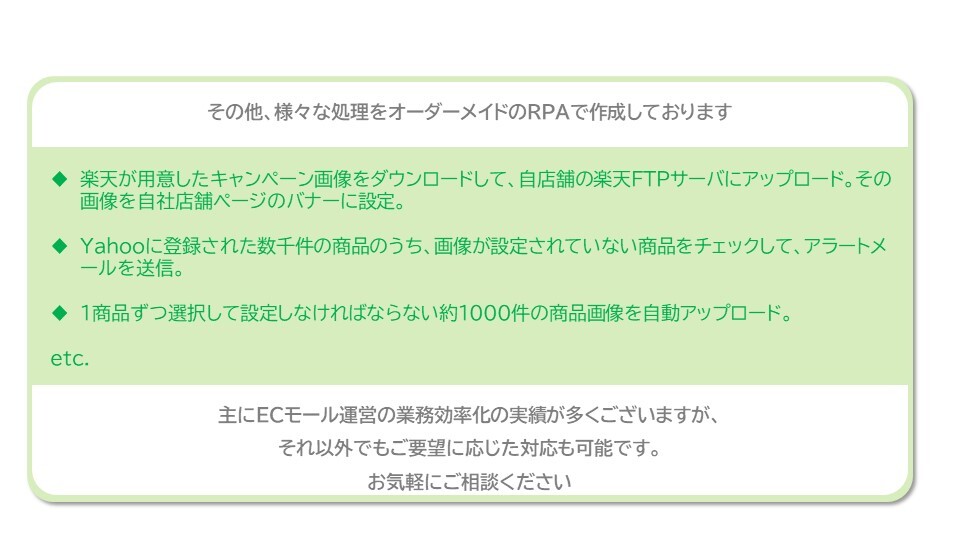 当社ではEC事業者様への対応を通じてRPAの取り組みを行ってきましたが、当社の大きな特徴の一つは、PowerAutomateなどの一般的なツールを使用するのではなく、お客様のご要望に合わせたオーダーメイド開発を行っている点です。これにより、お客様の業務フローに完全に適合したシステムを提供することができます。オーダーメイド開発には以下のようなメリットがあります。