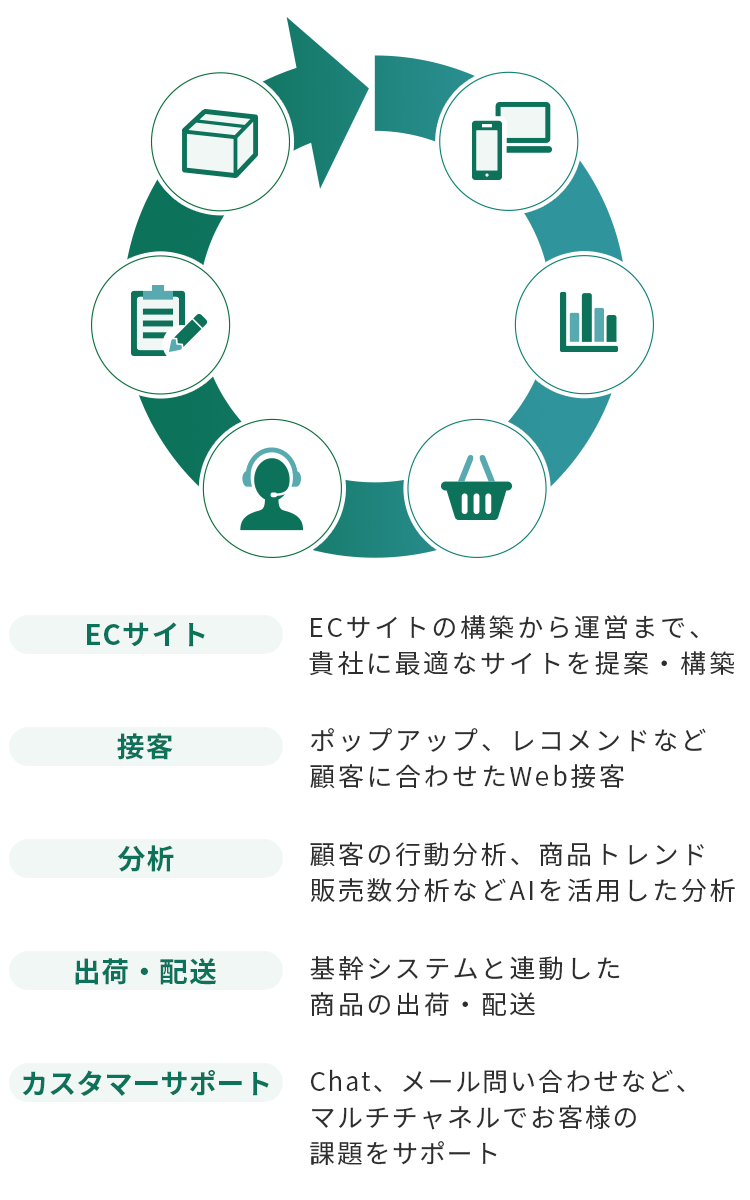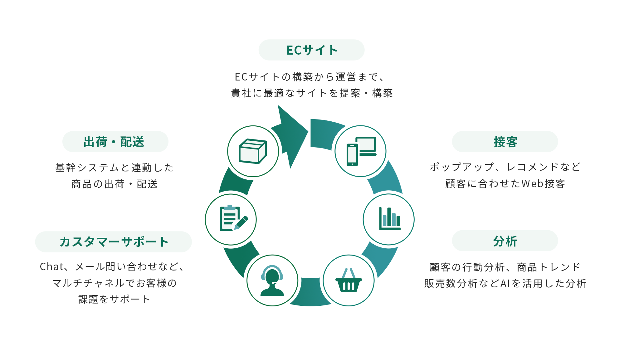 EC事業に必要なカート、決済、物流、広告、ECモール連携など、システム開発から運営代行までを幅広く運営。